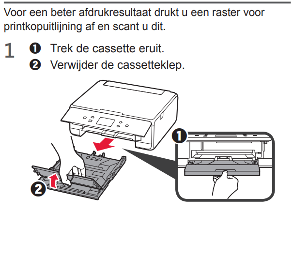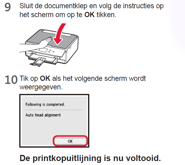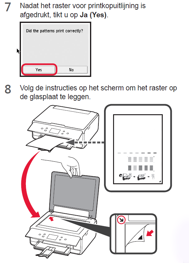 Op het scherm krijg je de berichten in verband met een uitlijnpatroon. Duw op <OK> en als de pagina is afgedrukt duw je op <JA>. Het afgedrukte blad leg je nu op het venster van de scanner. De hoek met de pijl op het blad naar de pijl op het scannervenster (blad mooi recht leggen). Druk op <OK>.