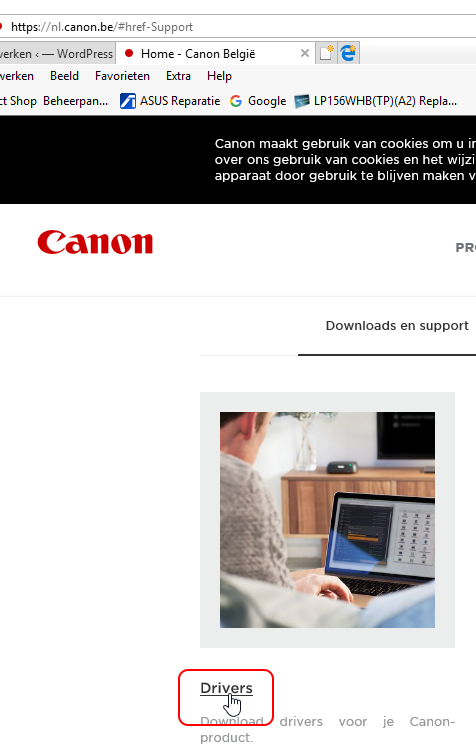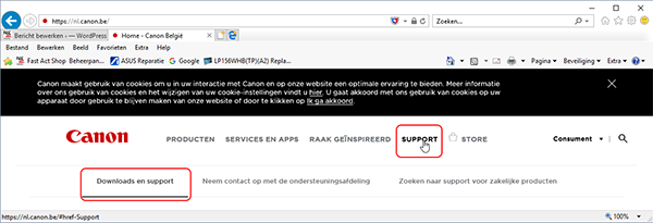 Eens je ‘Internet Explorer’ (IE) geopend, klik je bovenaan in de ‘Adresbalk’. www.canon.be en de <ENTER> toets.