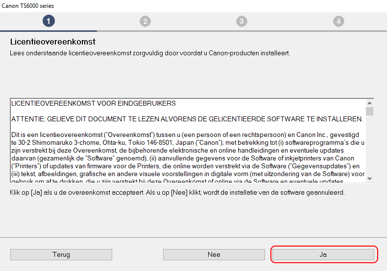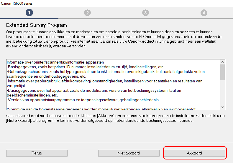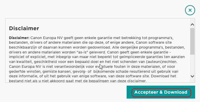 Onderaan het volgend venster trek je je niks aan van het ‘Canon’ venster in het midden, je mag dit zelfs sluiten met het kruisje bovenaan rechts. Maar je klikt onderaan in de gele balk op <Uitvoeren>.