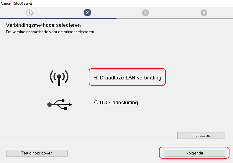 Vervolgens op <Volgende>, kijk als de draadloze Lan-verbinding aangevinkt staat.