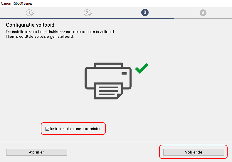 Als er tussendoor nog andere vensters verschijnen (Internet pagina’s) mag je deze sluiten. In het volgend venster kan je de printer als standaard zetten, is dit een bijkomende printer (extra 2e printer) dan kan je dit ‘af-vinken’. Klik op <Volgende>.