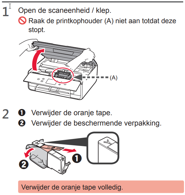 Eerst de printer uitpakken uit de doos en alle overtollige plastiek (oranje plakkers) wegnemen. Als je het deksel opent, dan moet je bij het sluiten het deksel EERST nog wat verder oplichten alvorens het deksel dan te sluiten.