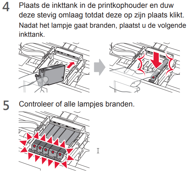 Je ziet nu hoe je de inktcartridges kan plaatsen (op het scherm). Plaats de inktcartridges in de juiste kleur, als de rode lamp onderaan brand is de cartridge goed geplaatst. De printer start de reiniging en maakt de cartridges klaar voor afdruk. Wacht tot dit gedaan is.
