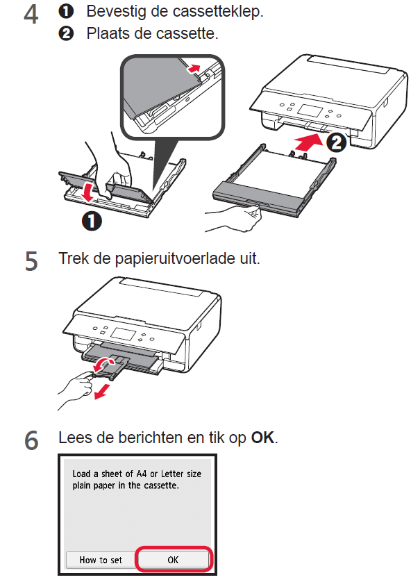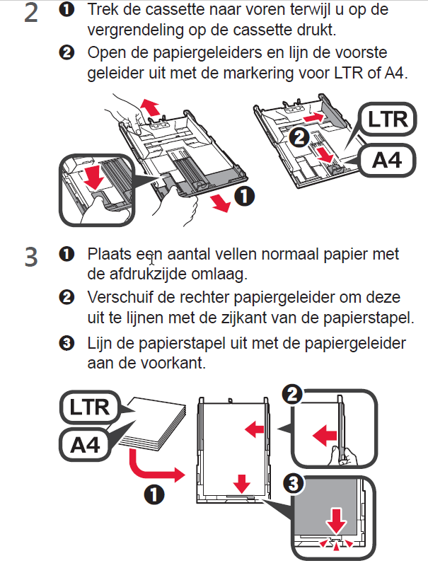 Plaats papier in de onderste lade. Je kan deze aanpassen naar A4 door de blauwe knop (driehoek) vooraan de lade in te drukken en de lade uit te schuiven.