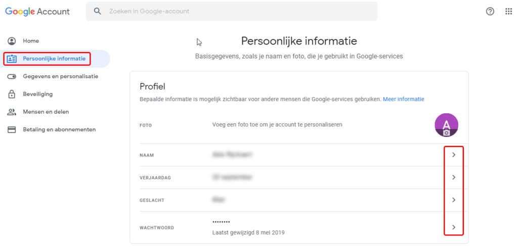 Bij het profiel kan je een foto toevoegen, uw naam aanpassen, geboortedatum instellen, geslacht en wachtwoord veranderen. klik daarvoor op de ‘>’ achteraan.