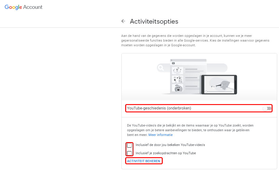 Hier kan je bepalen wat je ‘Google account’ bijhoud van wat je uitspookt op ‘Youtube’. Als je veel op ‘Youtube’ vertoevd, kan je dit beter uitschakelen. Verder kan je aanvinken wat er moet worden bijgehouden. Klik op ‘ACTIVITEIT BEHEREN‘ om alle details te bewonderen.