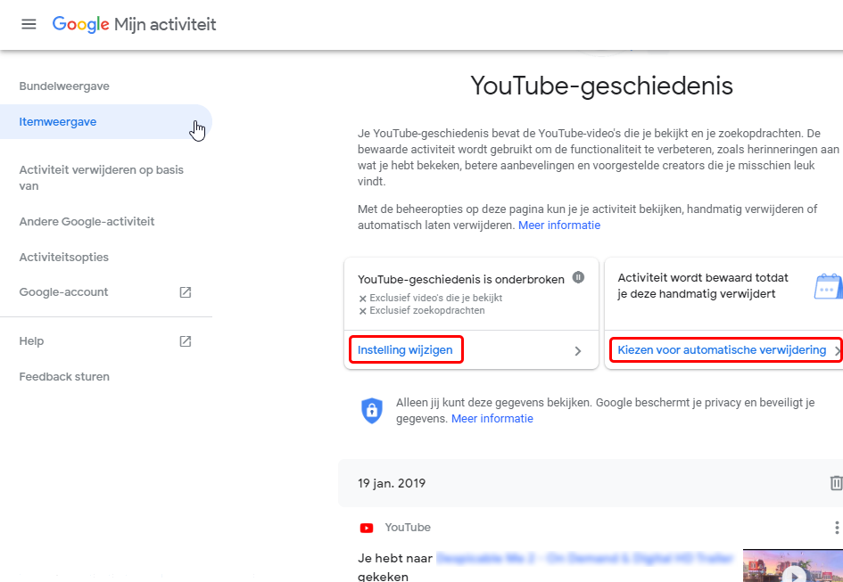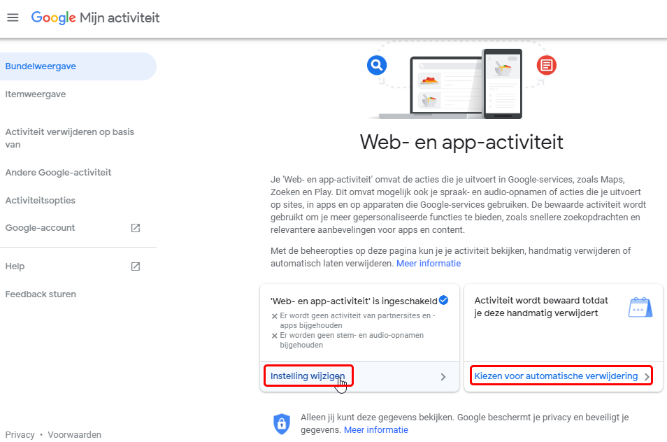 In het geopende venster zie je de ingestelde opties, je kan deze aanpassen onder <Instelling wijzigen>, je kan ook bepalen of je je activiteit handmatig of automatisch wenst te verwijderen.