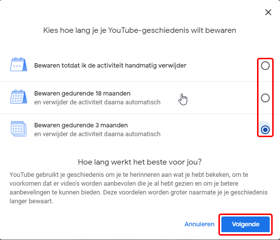 Kies je voor ‘Kiezen voor automatische verwijdering‘ dan kan je kiezen voor ‘Handmatig’ of ‘Automatisch’. Kies best voor’Automatisch’ daar de lijst zo groot is dat het onbegonnen werk is om dit ‘Manueel’ te doen. Eens op ‘Automatisch’ kan de de periode aanvinken en afsluiten met <Volgende>.