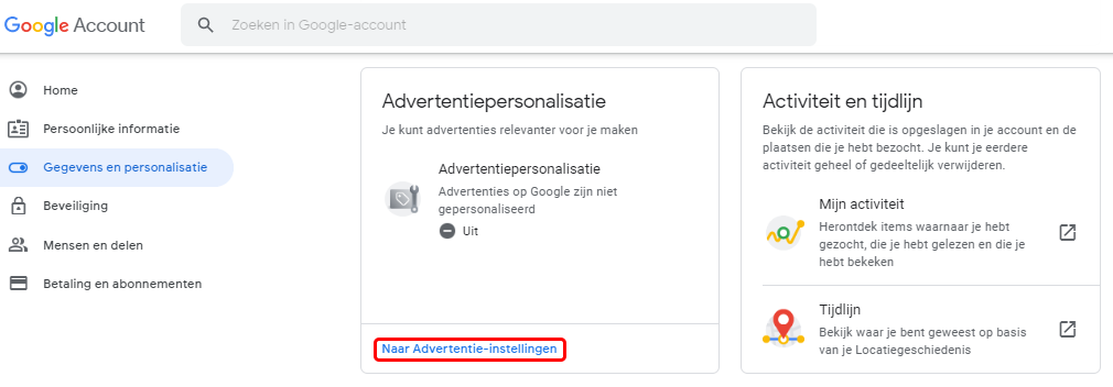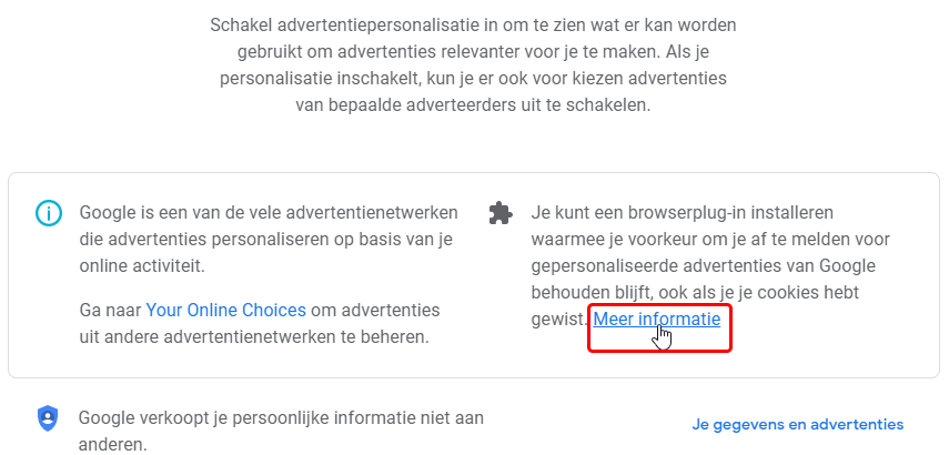 Dit is een onderdeel van je ‘Google Account’ dat je zeker moet aanpassen. Ga daarvoor naar ‘Naar Advertentie-instellingen‘. Dit betekend nog niet dat de vervelende reclames verminderen, enkel dat de reclames niet persoonlijk zijn. De voorgestelde reclames zijn algemeen.