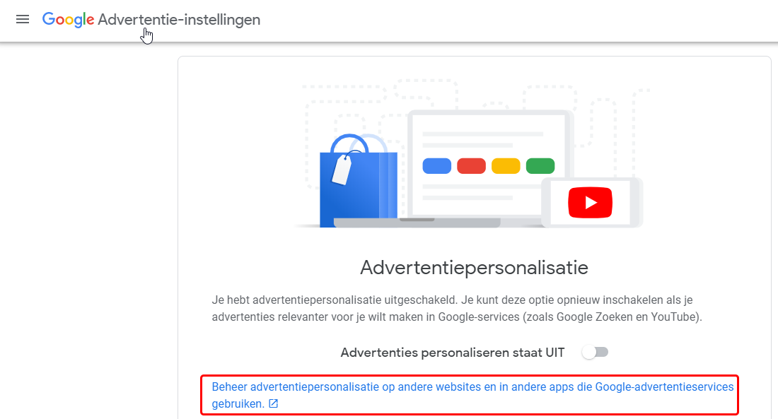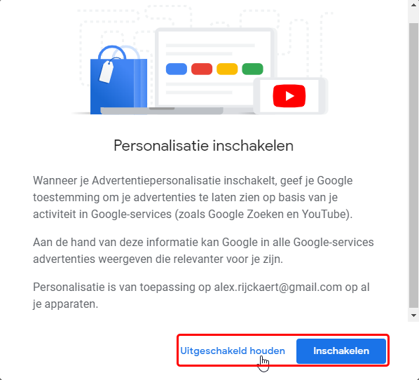 In het geopende venster kan je deze in of uitschakelen, ik verkies uitschakelen. Laat je dit aanstaan, dan zullen alle reclames gepersonaliseerd worden.