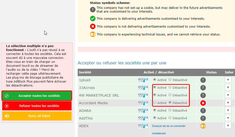 Als je de ‘Advertentiepersonalisatie’ uitgeschakeld hebt krijg je ook volgend scherm te zien. Hier kan je onderaan op de link klikken om de lijst te zien die je ‘Google account’ gebruikt om van de verschillende reclamebedrijven informatie te halen. Het volgend venster ‘Cookies toestaan’, en dan nog eens. In deze lijst kan je per bedrijf de informatie aan of afschakelen (‘Activé/Désactivé’). Verwacht geen wonderen, 90% van de bedrijven kan je ‘niet’ uitschakelen. Maar alle beetjes helpen niet.