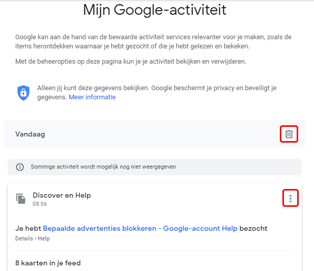 Hier zie je alles wat je ook maar gedaan hebt met je ‘Google account’. Klik op ‘Mijn activiteit’ om alles eens te bekijken en eventueel te verwijderen door op het ‘vuilbakje’ (de ganse dag) of de ‘3 verticale puntjes’ (elk individueel artikel) te klikken. Schrik niet van de hoeveelheid aan data dat er in je ‘Google account’ is opgeslagen.