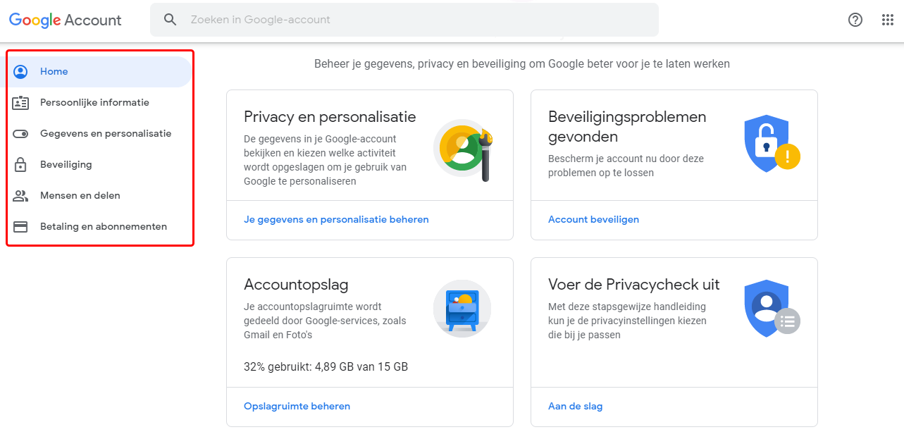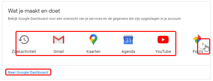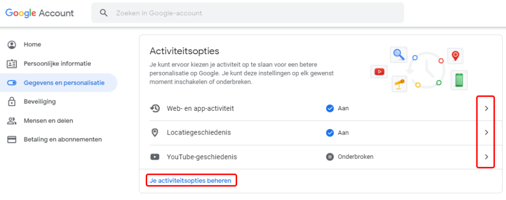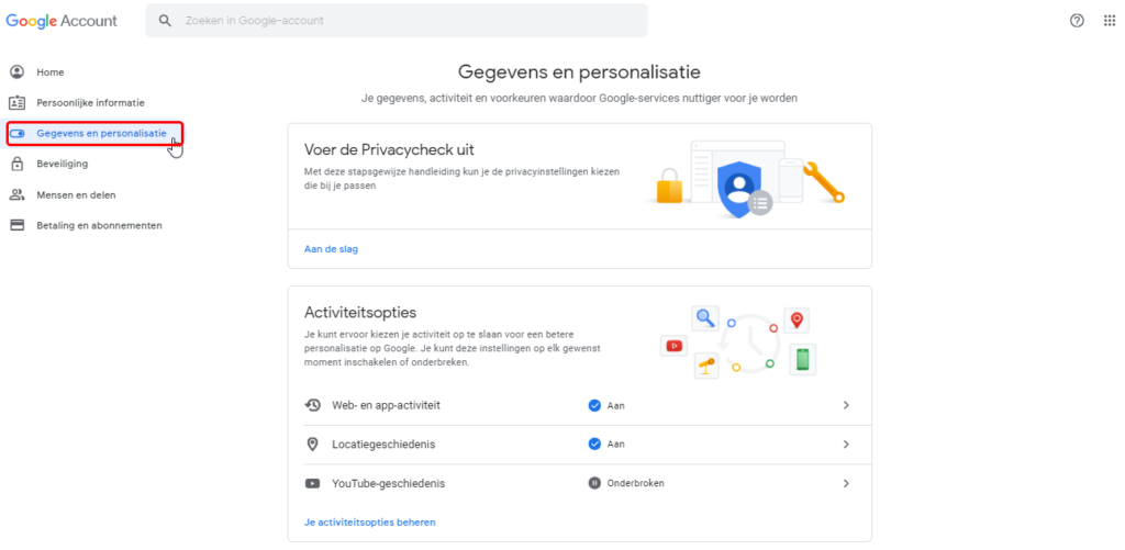 Hier kan je je google account personaliseren en je activiteit instellen. Google houd massa’s gegevens van uw activiteit bij, het is handig even door deze opties te bladeren.