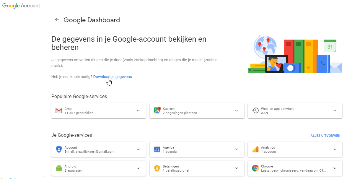 In volgend venster kan je al je gegevens downloaden. Hier zie je alle ‘Google apps’ die je data verzamelen. Indrukwekkend!