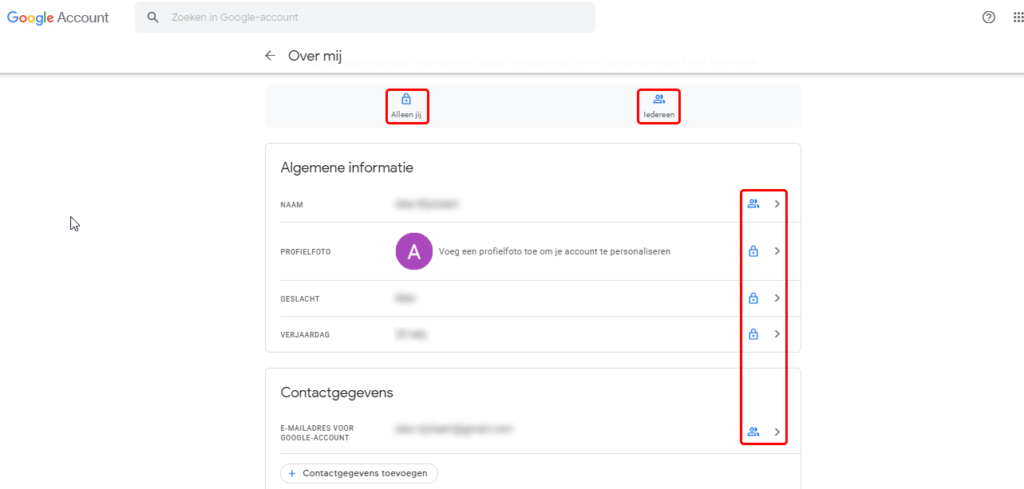 Om dit aan te passen klik je op ‘Ga naar Over mij‘. Je krijgt een gelijkaardig venster te zien, hier kan je kiezen wie wat te zien krijgt ‘Alleen jij’ of ‘Iedereen’. Rechts klik je op ‘>’ om dit aan te passen.