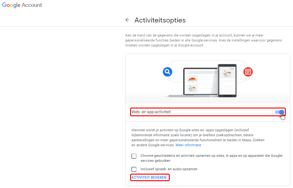Klik op ‘>’ rechts naast “Web en app-activiteit”. Hier kan je deze in of uitschakelen, Klik je onderaan op <ACTIVITEIT BEHEREN>.