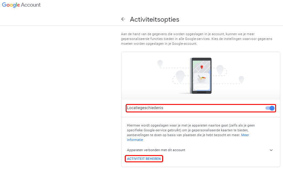 Kan je hier aan- of afzetten. Onder locatiegeschiedenis verstaan we het bijhouden van je verplaatsingen welke door de GPS van tablet, GSM, of laptop worden geregistreerd. Zo houd je ‘Google account’ nauwgelet elke verplaatsing bij die je doet. Als je op ‘ACTIVITEIT BEHEREN‘ klikt, krijg je een overzicht met tijdlijn en wereldkaart van al je verplaatsingen en locaties waar je al bent geweest. Je kan zelfs op je tijdlijn klikken en de route zien welke je die dag gevolgd hebt. Daarom krijg je ook een bericht op je GSM bvb als je een lokatie bezocht hebt. ‘Hoe was het in…’.Je kan de kaart ook op satelliet zetten en zo inzoomen tot de gebouwen die je bezocht hebt.