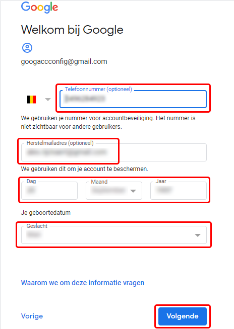 Nu geef je uw telefoonnummer in (gemakkelijker is om je e-mail adres in te geven). Geef je uw telefoonnummer in dan zal je een SMS ontvangen met een bevestigingscode. (niet handig als je uw GSM niet bij hebt). Geef je uw e-mail adres in dan ontvang je een e-mail met een code wat handiger is. Geef ook je geboortedatum in en uw geslacht. Klik dan op <Volgende>.