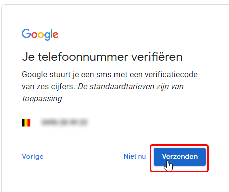In het volgend venster geef je in geval je voor telefoon hebt gekozen uw GSM nummer in (met de 0 ervoor) en klik op <Verzenden>. Je ontvangt dan een SMS met een code. Heb je gekozen voor ‘e-mail’ dan ontvang je een e-mail met een code. geef dan die code in.