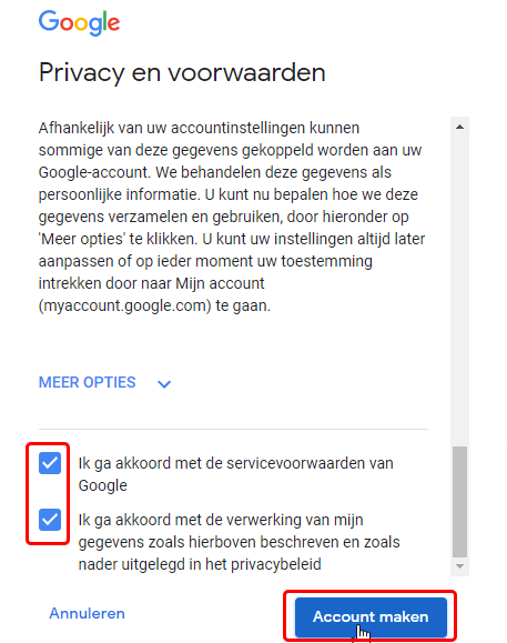 In het venster dat nu opent vink je de twee voorwaarden aan (anders kan je niet verder) en klik op <Account maken>
